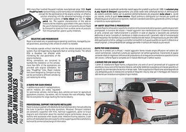 La centralina aggiuntiva RAPID è un modulo elettronico di nuova concezione che ottimizza ed incrementa fino al 25% le prestazioni di coppia e potenza dei moderni motori turbo diesel, nel rispetto delle più rigide normative sull'inquinamento.