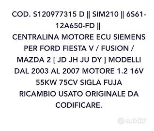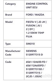 Centralina elettronica ECU per motori Ford / Mazda. Centralina elettronica perfetta di una autovettura demolita purtroppo con soli 60.000 km. Posso Spedire.