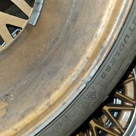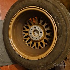 vendo 4 cerchi originali bbs anno 85 misure 6j 4x100 verniciati di oro canale lucido in buone condizioni non sono storti hanno solo un paio di difetti come si vede in foto su due. li ho montati sulla mia e30 e sono perfetti. hanno gli stemmi originali bbs e la verniciatura è perfetta. no borchie.