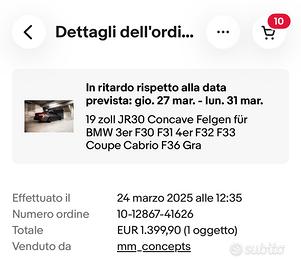 Vendo quattro cerchi originali Japan Racing acquistati nuovi l’anno scorso e utilizzati una sola stagione percorrendo pochi km , vendo per cambio auto . Prezzo 1000€ Cerchi in perfette condizioni pari al nuovo completi di bulloni e scatole originali Cerchi in lega griggio scuro doppia misura Anteriore 8,5x19 et35 5x120 Posteriore 9,5x19 et35 5x120 Erano montati su BMW F30 320d ma compatibili con altri modelli come serie 3 316 318 320 325 330 335 e46 e90 e91 e92 f30 f31 serie 4 418 420 425 f32 f33 f36 z4 e89 x1 e84 x3 e83 f25 serie 1 serie 5 ecc Cell / whatsapp 3286145478