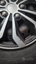 4 Cerchi e gomme per Fiat 500. Cerchi in ferro. Gomme termiche da sostituire (possibile usarle qualche mese). Copricerchi graffiati in plastica che si possono sostituire facilmente.