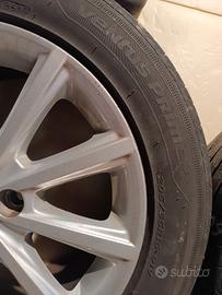 Per sostituzione auto, vendo 4 cerchi in lega completi di pneumatici estivi Hancock ventus prime 3 (205 55 r16). In aggiunta do uno pneumatico dello stesso modello di scorta (circa metà vita). Faccio presente che le gomme sui cerchi sono quasi da sostituire e nella scorsa stagione il computer di bordo non rilevava più i sensori degli pneumatici in quanto scarichi. Solo uno dei cerchi presenta alcuni graffi, come da foto, gli altri sono in ottime condizioni.