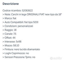Vendo cerchi in lega diamantati da 18”, normali segni di usura, li montava una fiat tipo ma compatibile anche con 500l e 500x, caratteristiche tecniche in foto.