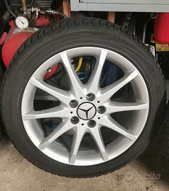 4 cerchi in lega replica Mercedes montati su classe B, nessun segno da parcheggio, sempre lavati ad ogni smontaggio, montate 4 gomme invernali 225/45-R17 91H un po' datate ma ancora idonee (usate qualche giorno fa sulla neve). Solo consegna a mano.