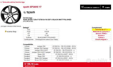 Causa inutilizzo vendo n.4 cerchi in lega modello SPATH SP36H Black Matt. I cerchi sono raggio 17 e con n.5 fori. Nello specifico sono 7.5 R17 5x160 ET 50. I cerchi sono stati acquistati nel 2018 e sono stati montati la sola stagione invernale del 2019, quindi sono in perfette condizioni. Il coperchietto centrale è stato adesivato con il simbolo di batman ma è facilmente removibile. Sui cerchi lascio montati i pneumatici 4season michelin. Hanno le spalle completamente finite ma ancora qualcosina di battistrada. La dimensione dello pneumatico è 235/55 R17 105 Y. Ritiro a mano in zona Rovereto / Trento / Folgaria / Mantova. Pagamento in contanti al ritiro oppure elettronico con paypal o subito. Eventuali costi di spedizione da concordare ed a carico dell'acquirente. Il prezzo indicato è comprensivo di tutti e quattro i cerchi. Gli pneumatici li regalo lasciandoli montati. N.B. --> I CERCHI VENGONO VENDUTI TUTTI ASSIEME! Non vendo sottomultipli.