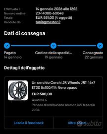 Vendo 4 cerchi Japan racing jr11 R16x7 et 30 mozzo 5x100/114.3 nero opaco , i cerchi sono come nuovi acquistati a gennaio , vendo perché ho dato via la macchina. Valuto scambi con altri cerchi ma 4x100 16/17 oppure 5x100 17 Si possono montare su Subaru impreza/forester/Legacy , Volkswagen polo, golf 4 , Audi A1/S1/ A3 prima serie , Seat Ibiza . solo ritiro a mano oppure con corriere ma organizzato dall' acquirente .