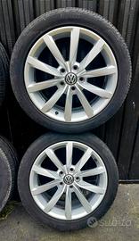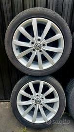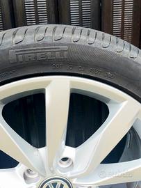 Cerchi 17 pollici, originali Volkswagen in ottime condizioni. Vanno su Golf, Passat e altri modelli. Cerchi usati poco, come nuovi, eccetto i 2 piccoli segni nelle foto. Inclusi sono anche i 4 pneumatici Pirelli P7 con 5-7mm di profilo Cinturato 225/45/17, DOT2013. Dato che hanno qualche anno in più, sono inclusi nel prezzo. Se interessati scrivetemi direttamente su subito per favore. Solo ritiro zona Forli-Cesena.