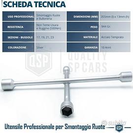 Chiave a Croce Professionale per Smontaggio Ruote Auto in Acciaio Temprato, per Bulloni da 17 - 19 - 21 - 23 - ROBUSTA | Fatta per Durare, Struttura Solida e Curata nel Dettaglio - MULTIFUNZIONE | Bussole da 17 - 19 - 21 - 23, la rendono idonea per la quasi totalità delle vetture - MANEGGEVOLE | Peso Contenuto e Impugnatura Comoda da Maneggiare, con Grip - RESISTENTE | Materiale Extra Resistente, non teme Usura e Ruggine, Testata fino a 500 Nm IL PRODOTTO: Chiave a Croce Professionale, Ideale da Tenere in Macchina, è uno strumento altamente Professionale e Robusto, che consente di svolgere il compito per cui è stata creata in modo rapido e sicuro; nel suo piccolo, sostituisce la pistola avvitatore pneumatica in dotazione a officine e gommisti. COMPATIBILITÀ: - Quasi Totalità delle Ruote Veicoli - Bulloneria 17, 19, 21, 23 DETTAGLI TECNICI: - Materiale: Acciaio Temprato - Sezione: Ø 13 mm - Bussole Esagonali: (4 Fisse) 17, 19, 21, 23mm - Colore: Silver - Finitura: Satinata - Peso: 944 Gr - Dimensioni: 355 X 355 mm - Resistenza Nm: Testata fino 500Nm - Resistenza: Non teme Usura e Ruggine - Bloccaggio: a Incastro - Lavorabilità: Grip Eccellente PER INFO CONTATTARE AL 3927091031 ANCHE LINEA WhatsApp OPPURE VIA E-MAIL: rtautoitalia2018@libero.it CONSEGNA: - Effettuiamo Spedizioni 24-48H in TUTTA ITALIA - Ritiro in Sede con Possibilità di Visionare il Prodotto - Vendiamo solo Articoli Nuovi PAGAMENTI: - PayPal - Con Carta - Bonifico Bancario - Alla Consegna con Contrassegno