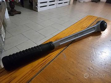 CRICCHETTO REVERSIBILE 3/4" DA 72 DENTI CON INVERSORE A CORONA E AGGANCIO DI SICUREZZA A PULSANTE, IN ACCIAIO AL CROMO VANADIO FINITURA CROMATA SATINATA, IMPUGNATURA COMFORT, LUNGHEZZA mm 505. REVERSIBLE RATCHET 3/4" IN CHROME VANADIUM STEEL WITH 72 TEETH AND WHEEL OPERATED REVERSAL SYSTEM WITH SAFETY QUICK RELEASE BUTTON, SATIN FINISHED, ERGONOMIC COMFORT HANDLE, LENGHT mm 505