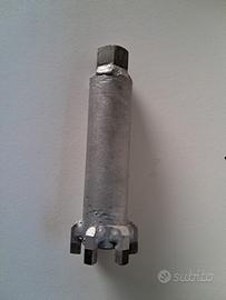 Vendo chiave per serraggio ghiera di bloccaggio manubrio Yahama X-MAX 250. Costruita in occasione della sostituzione dei cuscinetti della canna di sterzo e ha fatto il suo compito egregiamente. Dotata di un dado sulla estremità superiore per chiave a bussola da 24 cosi da poter applicare una chiave dinamometrica e serrare con la giusta forza.