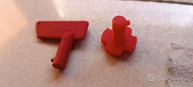Chiave staccabatteria in PETG priva di levetta. La modifica è utile per chi ha lo staccabatteria situato in zone calpestabili o di passaggio, ad esempio tra il sedile del guidatore e quello del passeggero in un furgone o in un camper, in modo che, a differenza di quello tradizionale con levetta che potrebbe rompersi ed interrompere l'erogazione del flusso elettrico in corsa, rimanga inserito senza problemi. La testa arrotondata ha 4 alette per un facile presa per l'inserimento ed il disinserimento dello staccabatteria.