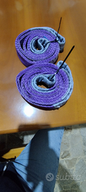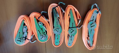 Salve, vendo cinghie a cricchetto con ganci sulle 2 estremità, misura Lunga 4.00 M larghezza fettuccia 3.5 cm portata credo sia sui 1000kg, altre 2 cinghie con occhiello finale lunghe1.5 M larghezza fettuccia 3.00 cm, portata a secondo del passaggio varia dai 2000 ai 1000kg.