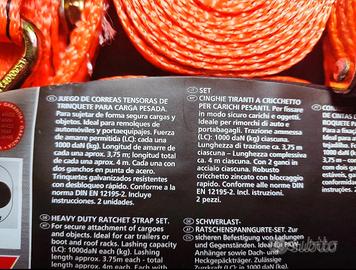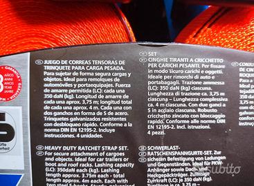 4 pezzi: Trazione ammessa (LC): 350 daN (kg) ciascuna. Lunghezza di trazione ca. 3,75 m ciascuna - Lunghezza complessiva ca. 4 m ciascuna. Con due ganci a S in acciaio ciascuna. Robusto cricchetto zincato con bloccaggio rapido. larghezza 2.5cm