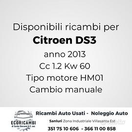 vendiamo ricambi DS3 anno 2013 cilindrata 1.2 kW 60 tipo motore HM01 cambio manuale Per un’immediata ricerca del ricambio richiesto contattateci telefonicamente o tramite whatsapp. SPEDIZIONE IN TUTTA ITALIA !!!!!!! ACQUISTIAMO E VALUTIAMO AUTOVETTURE FURGONI ecc…usate, sinistrate, fuse, incidentate e con tanti altri tipi di problemi e non…… Effettuiamo il RITIRO GRATUITO, ci occupiamo noi di tutte le spese di ROTTAMAZIONE, demolizione e disbrigo pratiche PRA Qualora foste interessati al passaggio di proprietà le SPESE saranno a carico NOSTRO….. Ci assumiamo qualsiasi responsabilità ed effettuiamo tutte le operazioni a norma di legge.