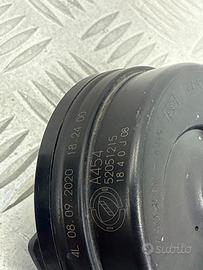 Clacson Jeep Renegade 500X Compass 52051215 12V tromba a chiocciola con griglia protettiva frontale e connettore elettrico 2 pin integrato. Componente 12V omologato E24, prodotto con corpo in tecnopolimero nero resistente alle temperature del vano motore. Data produzione 08.09.2020 come da marcatura visibile. Modello tecnico A454.