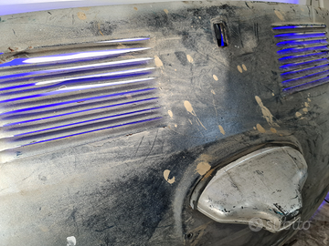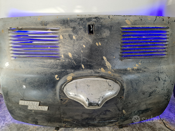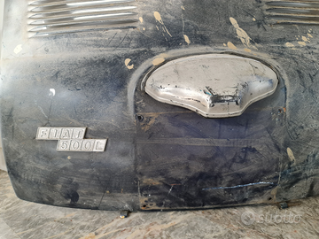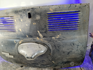 Cofano motore Fiat 500 con particolare patina originale di vissuto e vintage, completo luce targa, ottimo da appendere come un quadro in ambientazione modernariato. Nel retro del cofano è presente una illuminazione Blu a LED basso consumo con alimentatore 220 V eventualmente facilmente asportabile, per dare risalto al cofano appeso ad una parete.
