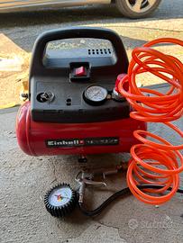 Vendo compressore portatile Einhell TC-AC 190/6/8 OF in ottime condizioni, perfettamente funzionante e pronto all'uso. Il modello è compatto e leggero, ideale per lavori domestici, bricolage, soffiaggio e gonfiaggio pneumatici. Essendo un modello Oil-Free (senza olio), non richiede manutenzione e può essere trasportato in qualsiasi posizione (anche sdraiato in auto) senza perdite di liquidi. Caratteristiche principali: • Serbatoio: 6 Litri (compatto e facile da riporre). • Pressione Max: 8 bar (regolabile tramite manopola dedicata). • Motore: 1.1 kW (1.5 HP). • Praticità: Impugnatura ergonomica per il trasporto e piedini d'appoggio stabili. • Sicurezza: Valvola di non ritorno e valvola di sicurezza integrate. Inclusi nel prezzo: • Tubo a spirale flessibile. • Pistola con manometro per gonfiaggio pneumatici (auto, moto, bici). Stato del prodotto: L'oggetto è stato tenuto con cura. Il serbatoio è stato regolarmente spurgato dalla condensa per preservarne l'integrità.