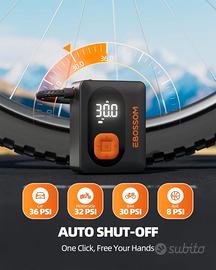Autonomia estesa: Batteria da 3600 mAh, fino a 6 pneumatici (195/65R15) gonfiati da 30 a 36 PSI con spegnimento automatico e funzione preset.