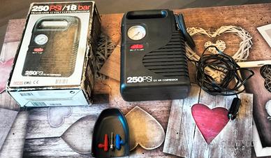 Compressore con attacco per auto per materassini letto , materassini e ciambelle mare , palloni , pneumatici per bici ecc ... completo di apposite puntine varie misure per gonfiaggio .