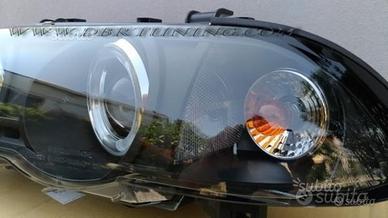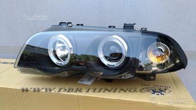 Coppia fari Angel Eyes LED BMW 3 E46 4 porte e station wagon dal 98 al 01, omologazione Europea ECE stampata sul trasparente anteriore.