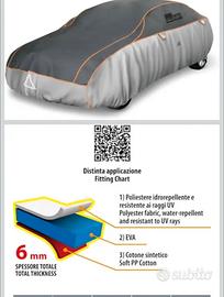 Bordi anteriori e posteriori elasticizzati per facilitare il montaggio e aderire alla carrozzeria, 2 cinghie per fissare il telo copriauto all'auto sotto scocca.