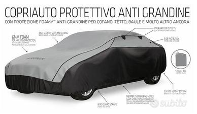 NUOVO MAI USATO_Copriauto protettivo antigrandine. Con speciale schiuma spessa 6mm ad alta densità Foamy per proteggere le parti sensibili della carrozzeria in caso di grandine. Rivestimento interno antigraffio per la carrozzeria. Quattro prese d'aria laterali. Custodia per riporlo inclusa. Bordo elasticizzato per facilitarne l'installazione. Occhielli predisposti per il passaggio di cavi di fissaggio o cavo antifurto (cavi non inclusi). Cinghie antivento. Per tutte le stagioni. Protezione UV. Traspirante. Impermeabile.