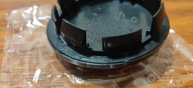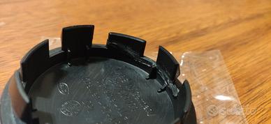 Coprimozzi borchiette per cerchi logo Volkswagen, diametro esterno 65mm - interno 58mm. Logo VW su sfondo nero (il colore blu è dato dalla pellicola protettiva da rimuovere nel montaggio). I coprimozzi sono nuovi, solamente uno dei quattro presenta due delle alette spezzate e reincollate (dovute ad una prova di montaggio errata) (vedi foto).