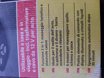 coprisedile con ventole e motori per massaggio.. riscaldamento e circolazione aria.... dotato di telecomando alimentato a 12 v. 6 motori... funzione 2 in 1 massaggio e calore. Borsa con chiusura a strappo per telecomando. Nuovo mai usato!!!