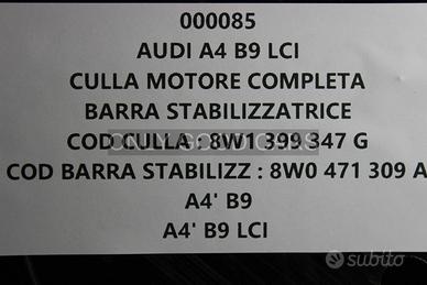 Ricambi Auto Usati Originali Recapito telefonico: +39 3533122170 anche WhatsApp. CULLA MOTORE COMPLETA E BARRA STABILIZZATRICE per AUDI A4 B9 LCI. COD CULLA : 8W1 399 347 G COD BARRA STABILIZZ : 8W0 471 309 A Compatibile con la serie: A4' B9 A4' B9 LCI Spedizione in tutta Italia, con spese di spedizione a parte, oppure ritiro presso le nostre sedi di Roma e Pomezia. Art. 000085 C
