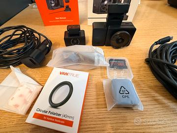 Telecamera dash a tre canali a doppia registrazione, Visione notturna a infrarossi Wi-Fi e GPS integrati con rilevamento velocità Controllo vocale + controller wireless Modolalità parcheggio 24/7 con accessorio kit cablaggio Compreso filtro polarizzatore 40 mm e microSD 256 GB