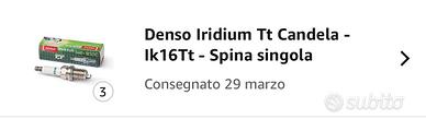 Vendo 3 candele, causa vendita immediata e non prevista dell’auto, le avevo appena acquistate su Amazon (vedi la data in foto) e montate su Yaris 3 cilindri, avranno meno di una settimana d’uso e meno di 200 km. percorsi. Non sono state pulite per evidenziare la corretta inserzione. Pagate più del doppio.Le condizioni sono pari al nuovo, le candele all’iridio sono le migliori, le più performati, le più longeve e le installazioni sono garantite ben oltre 100.000 Km. sono senza scatola. Accetto offerte