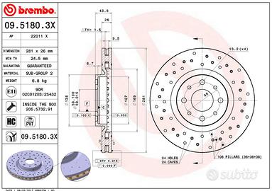 Disco freno anteriore sportivo ventilato e forato Brembo Sport per Magneti Marelli. P/N MD955F - analoghi a Brembo Xtra 09.5180.3X (ma con più fori sulla corona) PREZZO PER 1 DISCO - per una vettura occorre comprarne 2. Dischi anteriori Diametro 281 mm Foratura : 4 fori interasse 98 mm Spessore : 26 mm Centraggio : 59 mm Numeri di fori sulle facce : 72 (maggiori agli Xtra per un migliore raffreddamento e pulizia della pastiglia) Adatti per : MITO (955_) 1.3 MultiJet (955AXH1B, 955AXT1A) 66kW 90 cv 08/08 - 08/10 MITO (955_) 1.3 MultiJet (955AXP1A, 955AYC1A) 70kW 95 cv 09/09 - 10/18 MITO (955_) 1.3 MultiJet (955AXT1A) 62kW 84 cv 01/11 - 12/15 MITO (955_) 1.3 MultiJet (955AXT1A, 955AYA1A) 59kW 80 cv 12/13 - 12/15 MITO (955_) 1.4 Bifuel (955.AXG1A) 88kW 120 cv 04/16 - 10/18 MITO (955_) 1.4 Bifuel (955AXG1A) 88kW 120 cv 01/09 - 08/16 MITO (955_) 1.4 TB (955.AYB11, 955.AXB1B) 103kW 140 cv 12/13 - 10/18 MITO (955_) 1.4 TJet (955AXG1A) 88kW 120 cv 08/08 - 08/13 MITO (955_) 1.4 Turbo MultiAir (955AXM1A, 955AXR11) 99kW 135 cv 10/09 - 12/14 MITO (955_) 1.6 JTDM (955AXC1B) 88kW 120 cv 08/08 - 08/15 MITO (955_) 1.6 JTDM (955AXE1B) 85kW 115 cv 08/08 - 08/15 lo trovi https://abarthparts.it/index.php/dischi-md955f-magneti-marelli.html