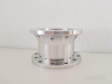 Vendo distanziale sterzo per volante sportivo realizzato dal pieno in alluminio con strumenti CNC avente spessore 4,5 cm per volanti racing sparco, omp, toora, sabelt, isotta, fk, nardi, luisi, ecc... Attacco a 6 fori classico con distanza tra i fori di 70 e 74 mm tradizionale e scanalatura per alloggiamento pulsante clacson.