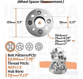 Coppia di distanziali ruota con centraggio ruota spessore 20mm foratura (pcd) 4x100 foro centrale (cb) 54,1 finitura superficiale anodizzazione kit 2pz (per 2 ruote) fornito con colonnette a piantare M12X1,50 adatto a Hyundai Kia, Peugeot.