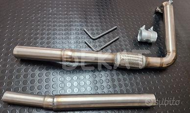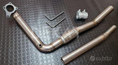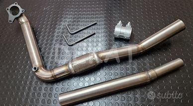 Downpipe ARTIGIANALE realizzato con tubo in acciaio INOX 304, adatto a sostituire il catalizzatore sui motori 1.2 TSI benzina 8V 85 / 106 CV del gruppo VW, con attacco turbina con flangia a 4 perni come in foto