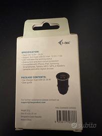 Vendo caricabatterie universale per auto i-tec DUAL USB Quick Charge 3.0, ideale per ricaricare rapidamente smartphone, tablet, navigatori e altri dispositivi durante i viaggi.