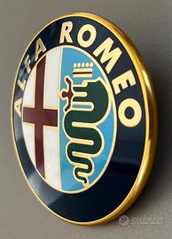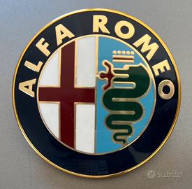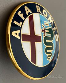 Emblema Alfa Romeo 2400-51016, in condizioni ottime. Dimensioni: diametro 75 mm interasse tra il centro dei perni 37 mm. lunghezza perni 17 mm,