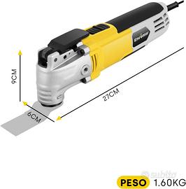 【Contenuto della Confezione】1 x multiutensile oscillante da 300W, 2 x lame semicircolari in plastica/legno, 4 x lame in plastica/legno, 1 x raschietto duro, 1 x piastra di levigatura triangolare, 20 x carta vetrata (5 di P60 / 5 di P80 / 10 di P120), 1 x borsa per il trasporto, 1 x manuale utente.