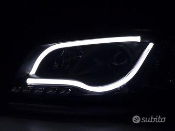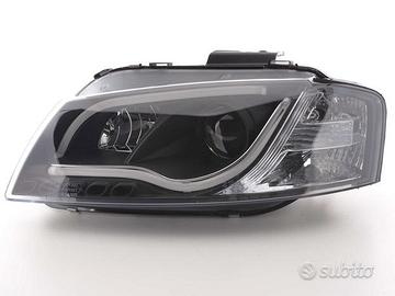 Gruppi ottici anteriori neri per AUDI A3 8P 3/5 porte 2003>2008 con frecce integrate e luci diurne a fibre ottiche (escluse vetture con kit xenon di serie)