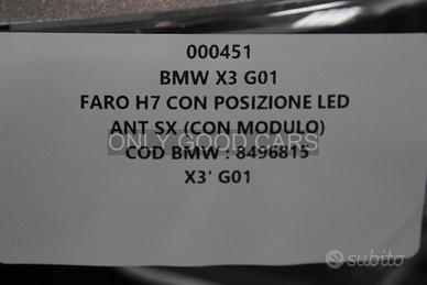 Ricambi Auto Usati --SOLO RICAMBI ORIGINALI-- Recapito telefonico: +39 3533122170 anche WhatsApp. FARO H7 CON POSIZIONE LED anteriore sinistro ( lato guida ) (con modulo) per BMW SERIE X3' G01 . (centraline si vendono a parte, vasta disponibilità pronta consegna) COD BMW : 8496815 Compatibile con la serie: X3' G01 Spedizione in tutta Italia (costo spedizione a parte) oppure ritiro presso le nostre sedi di Roma e Pomezia. ART. 000451 C