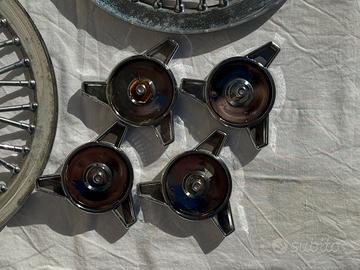 Vendo set di copricerchi a raggi in metallo per Fiat 500 N, 500 D, 500 F, 500 L, 500 R (tipo 110). Si tratta di un accessorio aftermarket dell'epoca per Fiat 500 che va applicato sui cerchioni originali al posto della coppetta coprimozzo originale. Possono essere fissati con il dado originale oppure completati con i gallettoni in dotazione. Uno dei gallettoni purtroppo negli anni è stato sistemato con un rivetto, che non ne limita in alcun modo l'utilizzo. Trattasi di materiale dell'epoca, usato, in buone/ottime condizioni. 120 euro