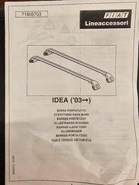 Vendo barre porta tutto per Fiat Idea, il modello è specifico per le Fiat Idea con le barre longitudinali originali. Sono della linea accessori Fiat nuove mai usate, codice originale 71805703.