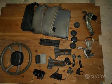 Ricambi Fiat Panda prima serie: specchietto retrovisore interno 10€, una tasca laterale nera sx 10€, coppia vetri laterali posteriori (fissi)40€, apribili 50€, una coppia portacasse complete di casse Kenwood 40€, vetro cofano posteriore 50€, kit riscaldamento 50€, tappetino cofano post 10€, motorino tergicristallo anteriore e posteriore 50€, portaoggetti (tunnel) centrale 40€, posacenere 10€, deviosganci 20€, coppia tasche laterali grigio complete di pulsanti x vetri elettrici 40€, vaschetta acqua tergicristalli 15€, crik e chiave x ruota 25€.