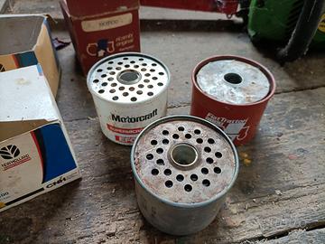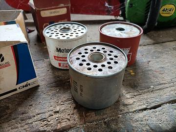 Lotto di filtri motore usati, alcuni ancora nelle loro scatole originali.