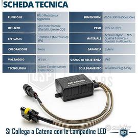 2 NEW Filtri CANbus Professionali Per KIT di TRASFORMAZIONE FULL LED HB3 | Resistenza Aggiuntiva Spegni Spia, Lampeggi, Cancella Errore | Da Collegare a Catena PLUG and PLAY, NO MODIFICHE. - Plug and Play (Connettori HB3) - Eccellenza dei materiali usati - Rimuove La Spia Errore - Rimuove Lampeggi e Sfarfalii - Rimuove Interferenze Radio COMPATIBILITÀ - KIT FULL LED HB3 INFO: Centralina CANbus Aggiuntiva, per Installazione di Lampadine LED HB3. Cancella Errori e Anomalie di Funzionamento su Luci Abbaglianti, Anabbaglianti, Fendinebbia ecc... Costruita con Materiali ad Alta Resistenza e Rifinitura, con Corpo e Connettori in ABS. POSSIEDE PRESA HIR2-HIR COME LA VOSTRA AUTO Non richiede forature o adattamenti del cablaggio, Si collega Plug and Play SCHEDA TECNICA: - Colore: Nero Opaco - Materiale: Guaina Termorestringente e Acciaio Inox - Condensatore Interno: 10.000uf (Microfarad) 16V - Lunghezza (mm): 70 - Larghezza (mm): 52 - Spessore (mm): 30 - Tecnologia: Condensatore Elettrolitico - Resistenza a polveri ed Acqua: IP67 - Peso: 205Gr (Singolo) - Applicazione: Solo collegamento - Confezione o Scatolo: Busta Plastica - Condizioni: NUOVO PER INFO CONTATTARE AL 3927091031 ANCHE LINEA WhatsApp OPPURE VIA E-MAIL: rtautoitalia2018@libero.it CONSEGNA: - Effettuiamo Spedizioni 24-48H in TUTTA ITALIA - Ritiro in Sede con Possibilità di Visionare il Prodotto - Vendiamo solo Articoli Nuovi PAGAMENTI: - PayPal - Con Carta - Bonifico Bancario - Alla Consegna con Contrassegno