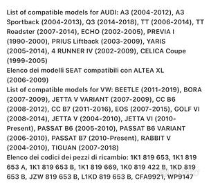 List of compatible models for AUDI: A3 (2004-2012), A3 Sportback (2004-2013), Q3 (2014-2018), TT (2006-2014), TT Roadster (2007-2014), ECHO (2002-2005), PREVIA I (1990-2000), PRIUS Liftback (2003-2009), YARIS (2005-2014), 4 RUNNER IV (2002-2009), CELICA Coupe