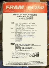 Per le applicazioni più comuni vedi la foto. Equivalenze con altri costruttori: AC-DELCO PF2046 PF2200 PF2209 ATLAS-COPCO 9712-5401-03 BALDWIN B7031 B7089 B7320 BT292 BECK/ARNLEY 041-8041 BIG A 92283 92609 92768 BOSCH 451104004 72116 CARCARE OF2842 CARQUEST 85283 85600EST 85609 85768 CENEX CO2819 CHAMP PH2819 CROSLAND 660 DEUTSCH D544 PH2819 DEUTZ 1160024 150157510 A1H4123 DONALDSON P550710 P550731 P551297 P552819 FIAAM FT4653 FLEETGUARD HF6159 HF6280 LF3417 FLEETGUARD LF3443 LF4154 LF708 LF760 FLEETRITE LFR-83417 LFR-84056 FORD E7HZ6731A FORD F2NN-6714-AA F2NN-6714-AB GENERAL MOTORS 25012325 25012425 25012636 GRAND PRIX PH2819 GROUP 7 L45189 HASTINGS B7031 LF404 LF454 HENSCHEL 711-922-853 IAPCO OF921 INGERSOLL-RAND 35292358 IPD 10074 ITM 11-13101 111-3101 JIFFY LUBE HL2842 JL260 KNECHT AW42 AW5 KOMATSU 600-211-5240 600-211-5241 KOMATSU 600-211-5242 600-211-6140 KOMATSU 600-211-6230 KRALINATOR L72 LIEBHERR 7020038 LINDE 016-000-000-200 LUBER-FINER LFH4207 LFP2312 LFP950 LUBER-FINER PH2818 PH2819 LUCAS GIRLING F3781 F6465 M.A.N. 6750358596 M.A.N. W9.40/18 MANITOU 1-173481 137183 MANN & HUMMEL W9.40 18 MANN & HUMMEL W9.40/18 MANN & HUMMEL W940/180 MANN & HUMMEL W940/29 MANN & HUMMEL W940/5 MARATHON PH2819 MARATHON-LETOURNEAU PH2819 MASSEY-FERGUSON 971238001 MASTER PARTS PH-2819 MERCEDES-BENZ 971238001 MIGHTY L30260 PH2819 MITSUBISHI FP100074 MOBIL L30260 L45189 MOTORCRAFT FL 292 MPA 2203 NAPA 1283 1609 1768 NEW HOLLAND 276516 NEW HOLLAND 81879134 NISSAN 58396-47601 PERFORMAX PO-122 PO-122 PHILLIPS 66 P54 PHILLIPS 66 WO1283 POCLAIN 2432-52 8888-840 9999-667 PURFLUX LS426 LS427 LS479A PUROLATOR L30054 L30260 L45189 QUAKER STATE L30260 L45189 PO-122 SECURITY PH-2842 SERVICE 1 OF260 SHELL L30260 L45189 UNOCAL OF1283 VALVOLINE L2819 VERA 10-00330 VOLVO 11700375 VW-AUDI-PORSCHE 911 107 754 00 VW-AUDI-PORSCHE 916 107 754 00 VW-AUDI-PORSCHE 930 107 764 00 WARNER PH2819 WIX 51158 WIX 51283 WIX 51609 WIX 51768 WIX 57374