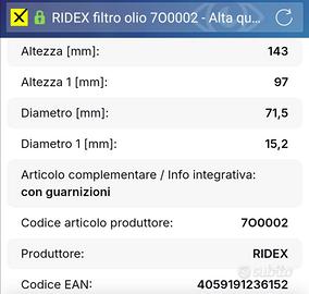 Vendo filtro olio Ridex nuovo.