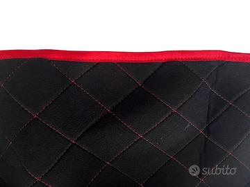 In vellutino nero spesso con bordi rossi e impunture romboidali rosse.