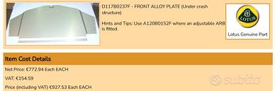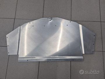 Fondo piatto anteriore ( sotto il crashbox ) per Lotus Elise o Exige o 2-11 (tutte le versioni dal 2004 in poi, eccetto V6). Codice ricambio Lotus: B117B0237F o C117B0237F o D117B0237F ( Panel, front undershield ) Prezzo del ricambio nuovo (probabilmente non disponibile), intorno ai 900€ ! La lamiera di alluminio ha la stessa identica forma dell'originale, ma è una copia realizzata su misura. Preferibile consegna a mano, ma disponibile alla spedizione a prezzo da concordare.